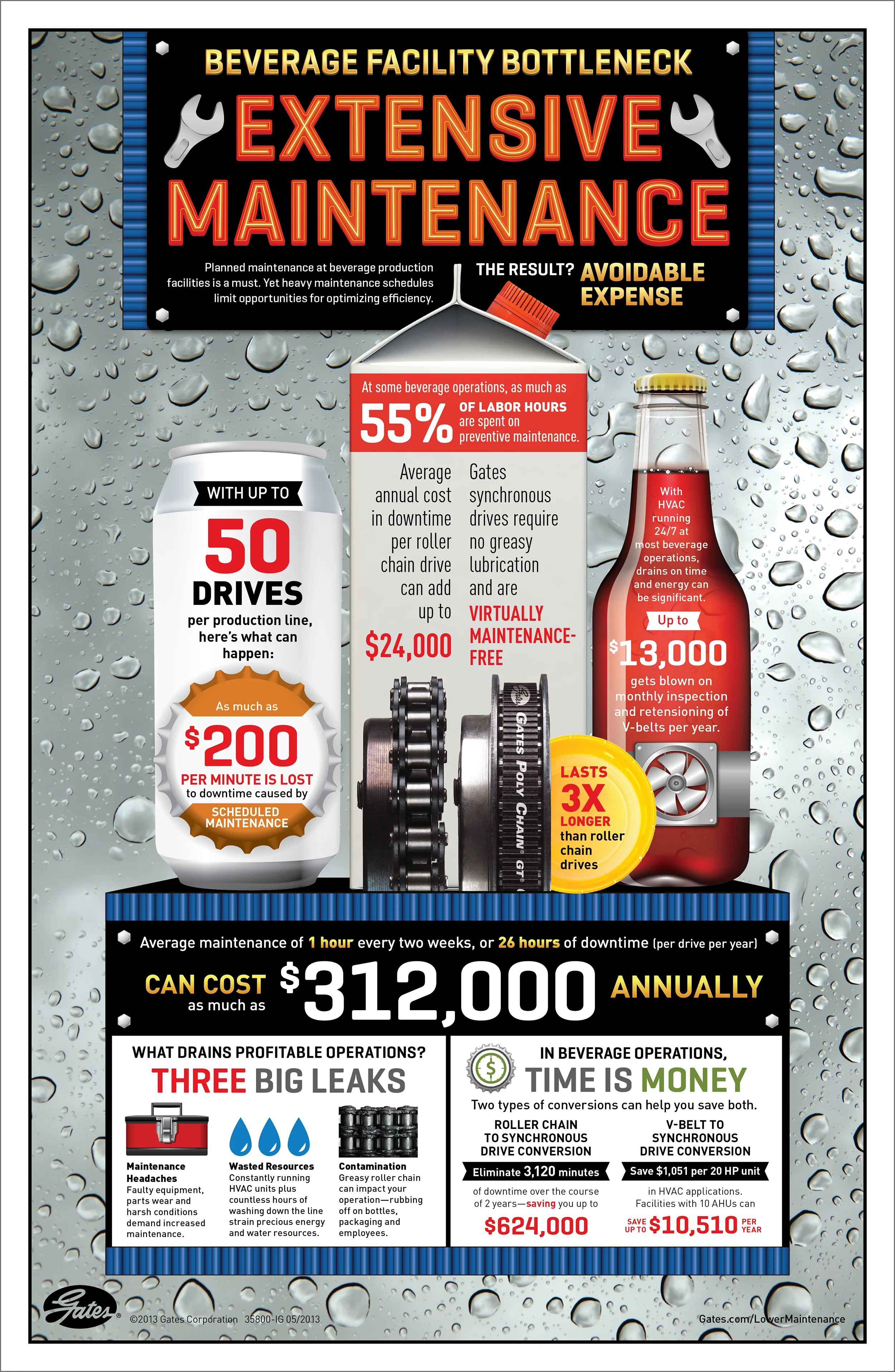 An infographic-style illustrated poster served as a leave behind to remind key influencers of beverage facility challenges—and how they can minimize the things that add cost or bring down efficiency once they convert to Gates Poly Chain. Representing the beverage industry using images of the various containers familiar to beverage manufacturing as the dominant visuals helped reinforce the statistics, and showcase the side-by-side comparison image of roller chains versus Gates Poly Chains. Stock illustrations were reworked to design the custom visual representing the various beverage segments. Actual Gates Poly Chain images were used as blue border elements.